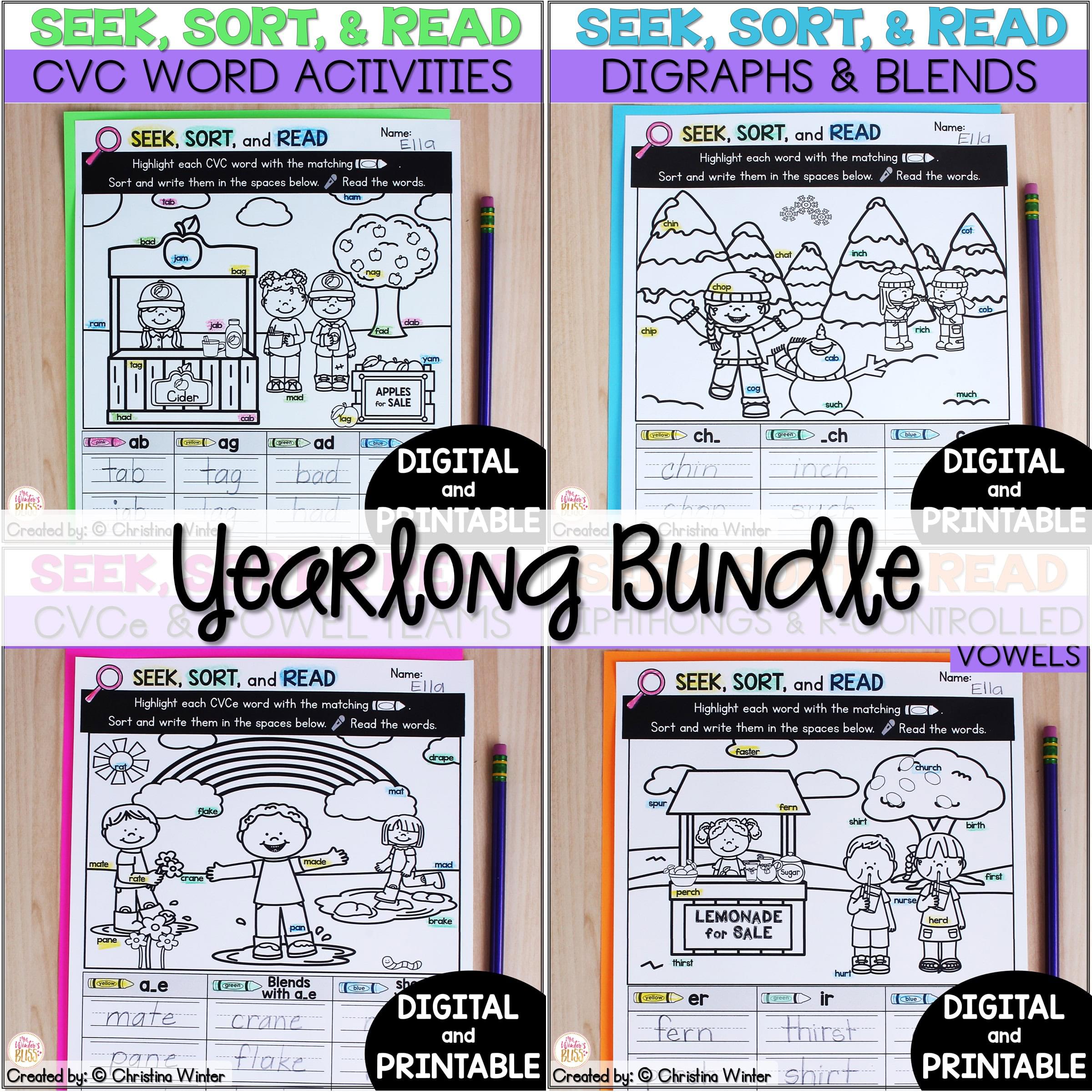 CVC, Digraph & Blend, CVCe (silent e) & Long Vowel, R-Controlled & Diphthong Phonics Word Activities Bundle