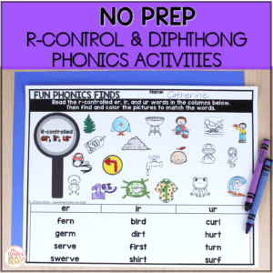 Help students sharpen phonemic awareness skills with Fun Phonics Finds! These NO PREP r-controlled vowel & diphthong phonics activities are an engaging way to help students demonstrate their understanding of sounds and practice writing words with the target sound-spelling pattern.